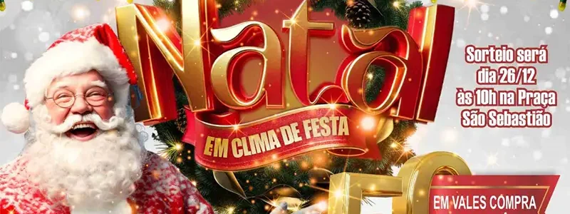 50 mil em vales compra e muitos prêmios. Sorteio será dia 26/12 às 10h na Praça São Sebastião. Período da campanha: 27/10 até 24/12. Muitos Prêmios para o sorteio presencial. Compre nas lojas participantes, peça seu cupom, preencha e coloque na urna da loja que comprou!